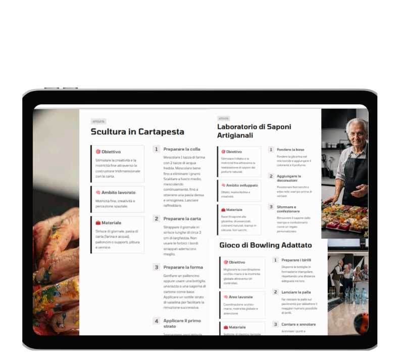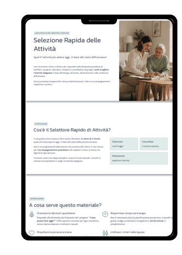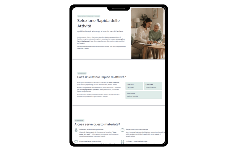 Scopri in pochi secondi quale attività usare in base a energia, attenzione, umore e condizione della persona anziana.