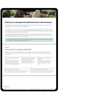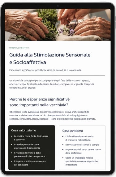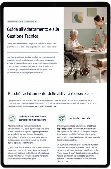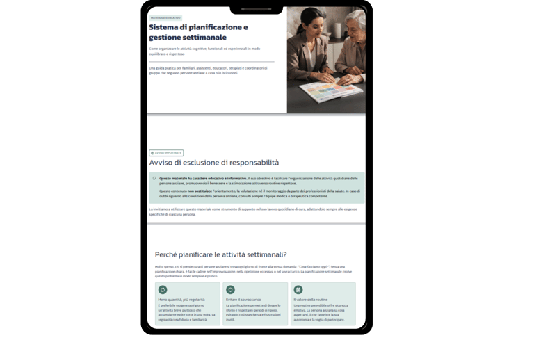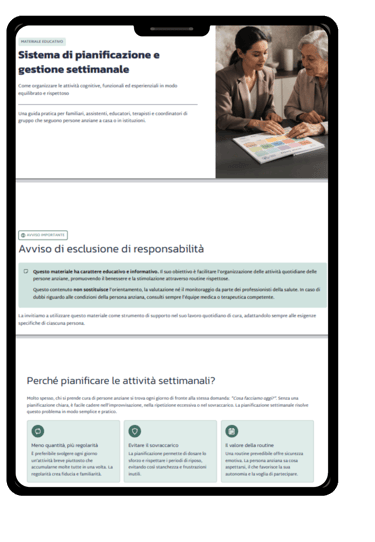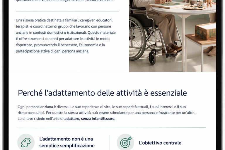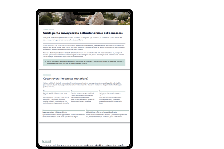 Confidiamo pienamente nella qualità e nell'utilità di questa risorsa, poiché è stata sviluppata per supportare un accompagnamento rispettoso e strutturato degli anziani, facilitando l'applicazione delle attività nella vita di tutti i giorni.