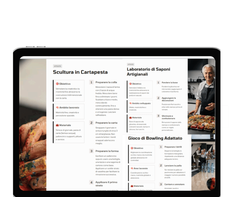 Sistema completo con attività cognitive, motorie e funzionali per risparmiare tempo e lavorare con più sicurezza ogni giorno.